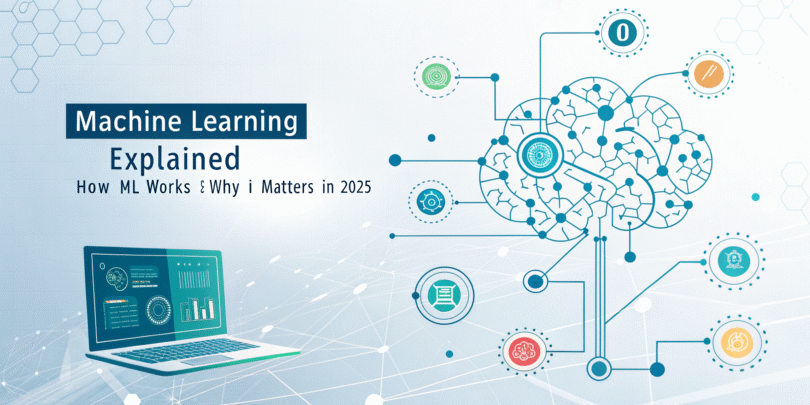 Machine learning explained in simple terms is the easiest way to understand how modern artificial intelligence works in 2025. Many beginners confuse machine learning with artificial intelligence, assuming they are the same thing. In reality, artificial intelligence (AI) is the broader concept of making machines intelligent, while machine learning (ML) is a specific approach used to achieve that intelligence. In simple words, AI is the goal, and machine learning is one of the most powerful tools used to reach that goal.